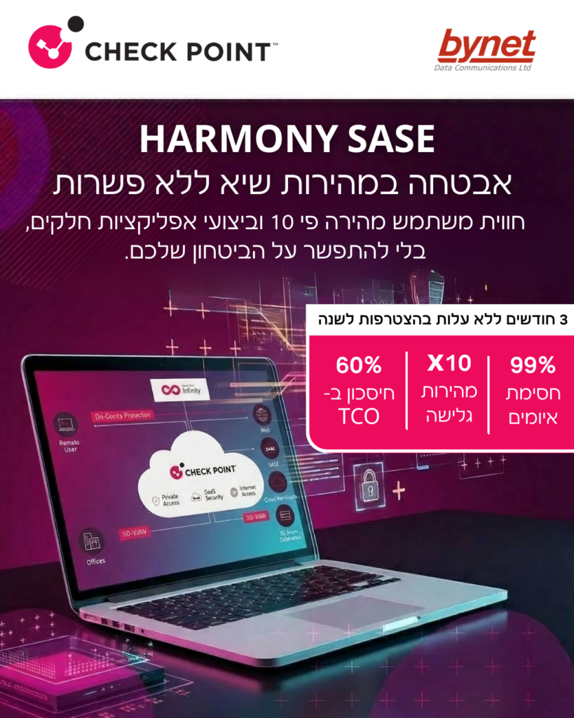 הכירו את מעטפת ה-Harmony של Check Point בהטמעת המומחים של בינת: שילוב עוצמתי בגישת "Prevention-First" שמגן על הדרך שבה העובדים מתחברים (SASE) ועל התוכן שהם צורכים (Email & Collaboration).